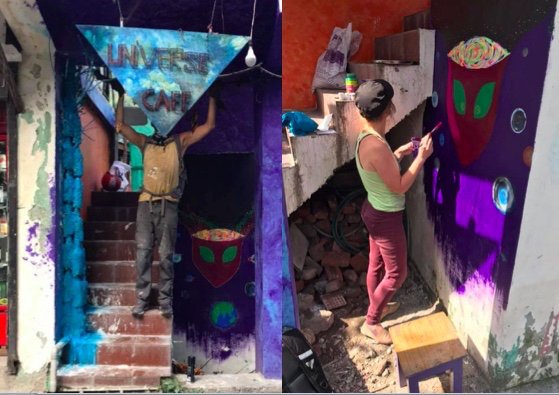Lauren, our yoga instructor from the Milky Way Galaxy, organizes a street art project outside a psy-trance cafe. We paint an alien mural and construct a tree made of Tuborg beer bottles, as villagers watch in bemusement.