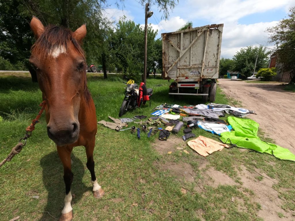 I stop on the side of the road by a tied-up horse and unpack all my gear to dry it under the sun. i decide that’s it, I’ve had enough. Put me back into The Matrix, stat.